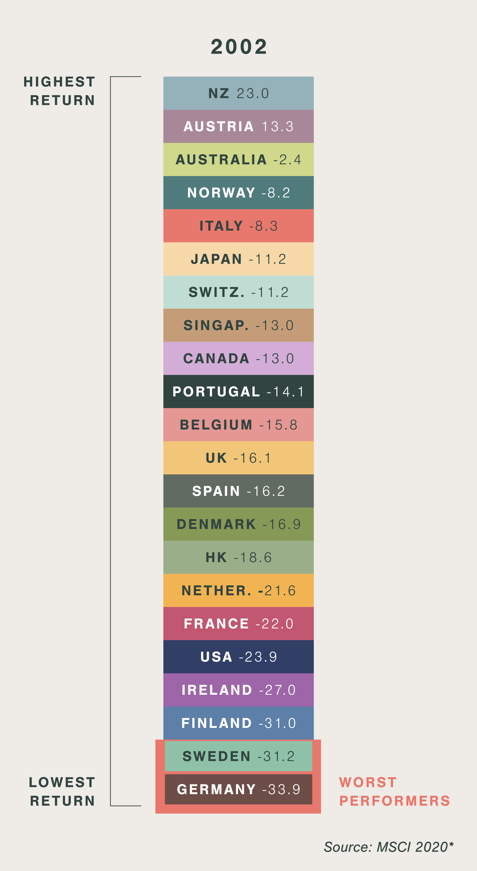 In 2002, out of 22 markets, Sweden and Germany performed the worst. If investing were easy, you would assume that to get better returns the next year, all you must do is avoid the Swedish and German stock markets. Unfortunately, if you did that, in 2003, you would have missed out on the two best-performing markets, which you guessed it, were Sweden and Germany. We trick ourselves into seeing patterns where none exist.
